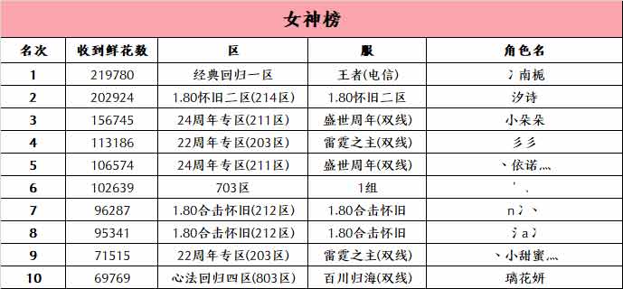 ”名单也火热出炉,鲜花承载了他们的深情厚意,成就了十大女神,也成就了自己的荣耀。
